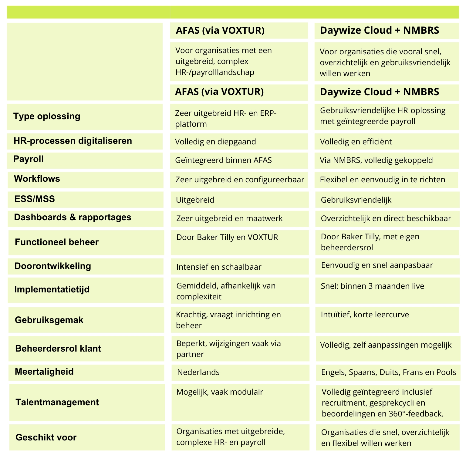 Organisaties verschillen in omvang, sector en volwassenheid. De HR Hub ondersteunt meerdere systemen, zodat de oplossing aansluit op jouw omvang, sector en HR-behoefte. AFAS (via VOXTUR) en Daywize Cloud + NMBRS bieden allebei een moderne HR- en payrolloplossing. In onderstaande tabel zie je in één oogopslag de belangrijkste verschillen.