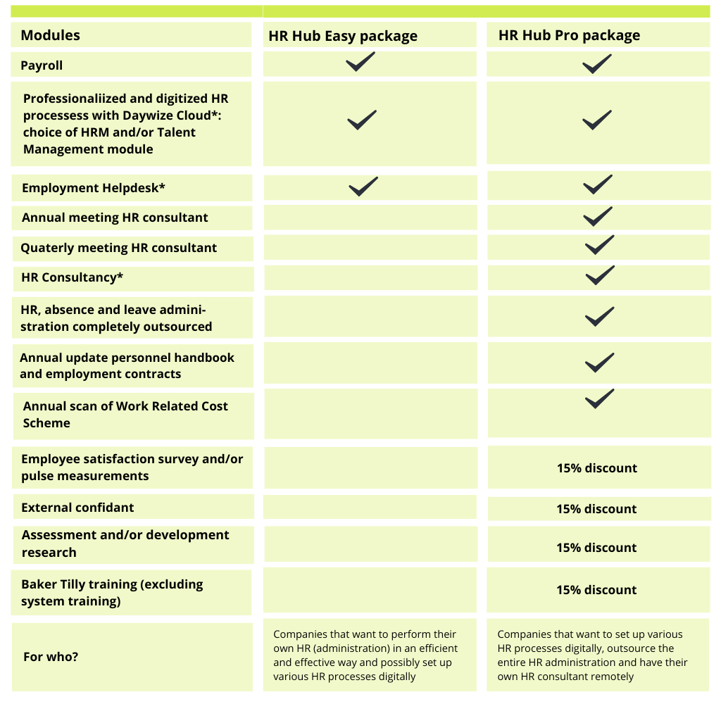 Change is a constant factor in the field of Human Resources. Digitalisation, new legislation, talent development and employer branding are all increasingly vying for your attention. At the same time, you want to keep a clear overview, work accurately and make sure everything complies with the rules. Baker Tilly's HR Hub enables you to do all that in a single solution: a modern HR and payroll system, combined with flexible access to our experienced HR specialists. The ideal solution for SMEs and larger organisations looking to professionalise and future-proof their HR processes.