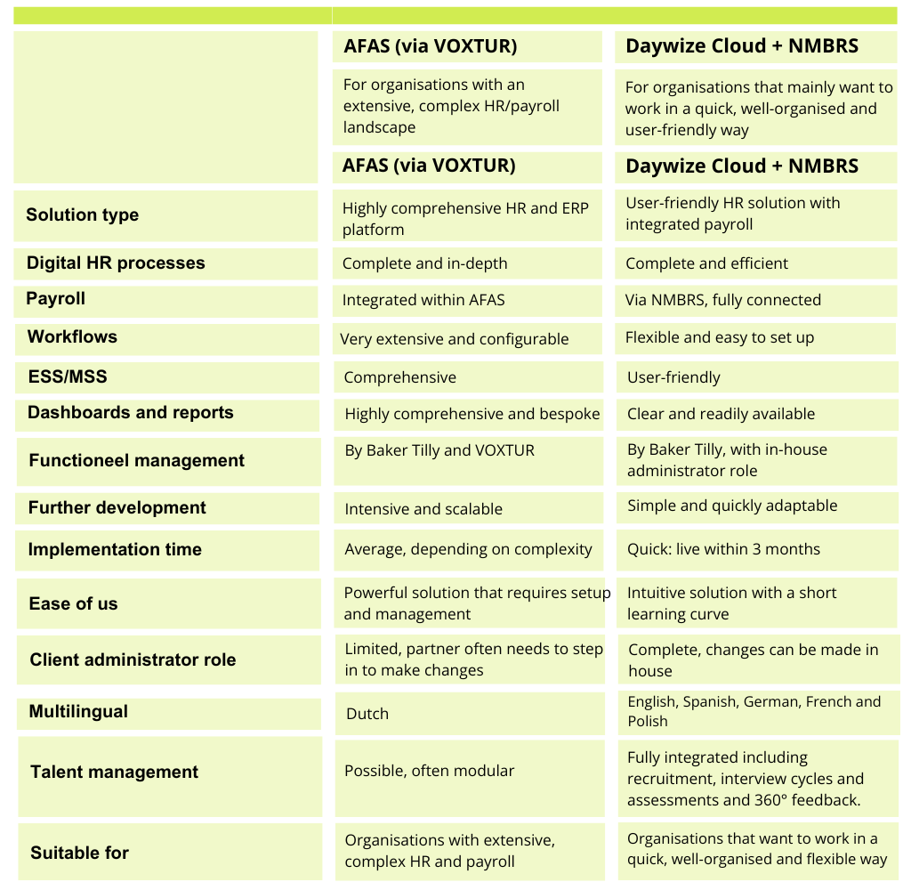 Organisations differ in size, sector and maturity. HR Hub supports multiple systems so that our solution always fits your size, sector and HR needs. AFAS (via VOXTUR) and Daywize Cloud + NMBRS both offer a modern HR and payroll solution. The table below shows the main differences at a glance.
