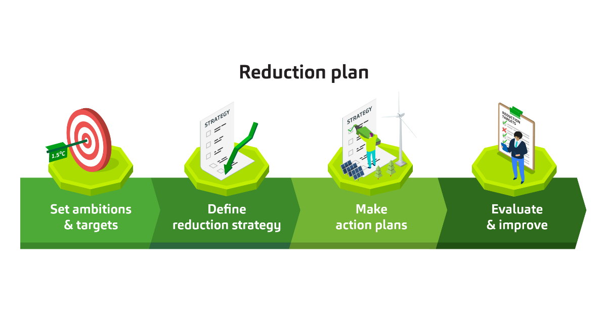 Once your carbon footprint is mapped, the real work begins: taking concrete steps towards net zero. That means setting clear goals, developing an appropriate strategy and translating them into actions within your organisation and supply chain.